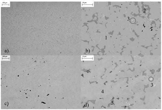 Backscattered electrons SEM images of the Co2ZrSn (a,b) and Co2HfSn (c,d) annealed alloys. In accordance with the results of the Rietveld refinement of the XRD patterns (Figure 1 and Table 1), the observed phases are the L21-type Co2ZrSn full-Heusler (1), the C15-type Co2Zr (2), CoSn (3), the L21-type Co2HfSn full-Heusler (4), and the C15-type Co2Hf (5).