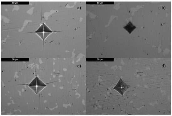 As expected, significant cracks have been observed after the first indentation, which has been used to determine the hardness, as reported in Table 2. After light polishing of the surface using a 3 µm diamond paste, the radial cracks were no longer visible, indicating that these are extremely shallow. In Figure 3, as an example, one of the several indentations performed for each alloy is shown before and after the polishing treatment. No secondary cracks propagated from the Vickers imprint, which indicates that the whole load was transferred to the radial cracks, allowing an accurate estimation of the fracture toughness (KIC). The same result was observed for all the other indentations.