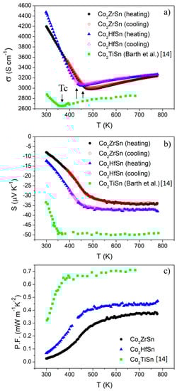 The trends of the electrical conductivity (σ), Seebeck coefficient (S), and power factor (PF) of annealed Co2ZrSn and Co2HfSn ingots as a function of the temperature are shown in Figure 4. The transport properties were measured imposing a cyclic ramp of temperature in order to ensure the thermal stability of the samples and the reproducibility of the results under thermal cycling. Since no hysteresis is observable between heating and cooling, it is confirmed that the specimens are stable and the outputs are reproducible. Values previously obtained for Co2TiSn [] are reported for comparison. It should be noted that the values measured in this work refer to samples containing metallic secondary phases (i.e., Co2Zr and Co2Hf) [], which likely tend to increase the electrical conductivity and lower the absolute value of the Seebeck coefficient with respect to the corresponding single-phase materials.