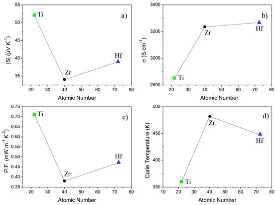 Considering Co2TiSn and Co2HfSn, which respectively show the largest Seebeck coefficient and electrical conductivity in the series, as end members, we could expect that if Ti is progressively substituted by Hf, the absolute value of the Seebeck coefficient would decrease, while the electrical conductivity would increase. As suggested by Figure 5d, the substitution of Ti with Hf would shift the Curie temperature at higher values, similarly to Co2TiZ (Z = Si, Ge, Sn), where a fine tuning of TC can be achieved by substituting the Z atom []. An increasing value of TC can be useful in spintronics and spin-caloritronics applications, where it is desirable to have ferromagnetic materials even at high temperatures [].