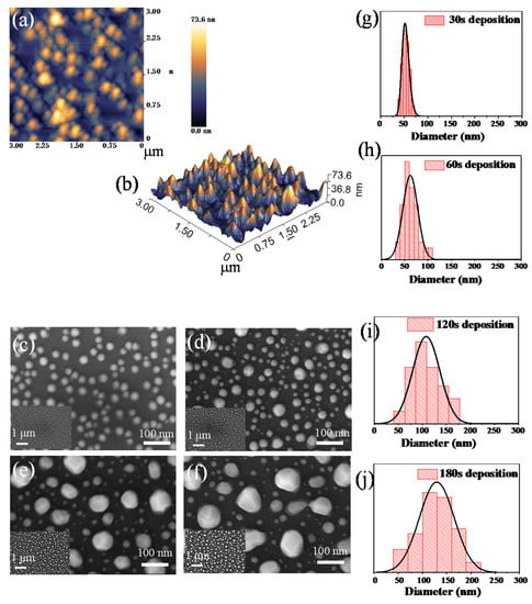 (a) Atomic force microscope (AFM) top-view of 3 × 3 μm2 of copper nanoparticles; (b) corresponding the 3D image; (c–f) SEM images of copper nanoparticles with different deposition times between 30 and 180 s fabricated at 900 °C; (g–j) corresponding diameter distribution histograms.