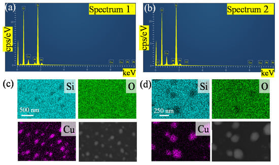 The SEM image of copper nanoparticles and the corresponding elemental mappings by EDS are shown in Figure 2. Si, O and Cu were observed in the sample, and the peaks of Si, O, Cu and Pt can be found in the EDS spectra. Since the sample was fabricated directly on the quartz substrate, the measured Si and O contents account for most of the color observed in Figure 2c,d. Before testing, we sputtered Pt with a nanoparticle size of 20 nm on copper nanoparticles to increase the conductivity of the sample and observe nanoparticle topography from charge accumulation at higher magnifications. From Figure 2a to Figure 2b, the amount of copper deposition increased and the proportion of the Cu element increased. It can be seen in Figure 2a that the time of sputtering for copper was less than it was the Figure 2b, and the Cu in Figure 2a accounts for 5.54%. The longer sputtering time evidenced by the proportion of Cu accounts for 9.35%. This also proves that the copper nanoparticles remaining on the substrate increase with increasing deposition time. The blue dots in Figure 2c,d show the magnification of copper nanoparticles, which also corresponds to the SEM image. The island-like distribution is also confirmed by Figure 2c,d’s copper distribution caused by the SSD growth mechanism [41,42].