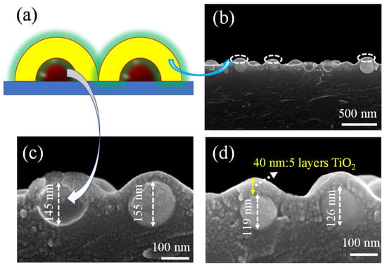 (a) Schematic illustrations of the Cu/TiO2 composite film: the arrows represent copper nanoparticles and TiO2 films, respectively. (b) SEM side-view of the Cu/TiO2 composite film. (c,d) Enlarged SEM side-views of the Cu nanoparticles covered with TiO2 of varying thickness.