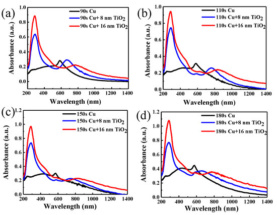 Absorbance evolution with TiO2 thickness on copper nanoparticles with different deposition times: (a) 90 s, (b) 110 s, (c) 150 s, (d) 180 s.