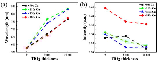 (a) The change of absorbance peak position of copper nanoparticles covered by TiO2 of different thickness, (b) the change of the peak absorbance position of copper nanoparticles covered by TiO2 of various thicknesses.