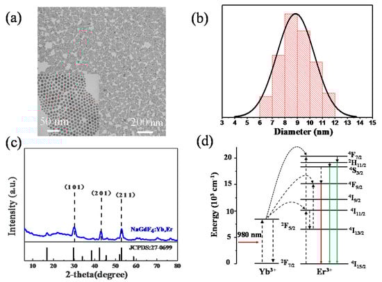 (a) TEM image of NaGdF4:Yb, Er nanoparticles; (b) corresponding diameter distribution histogram; (c) XRD pattern of NaGdF4:Yb, Er; (d) the mechanism of up-conversion processes of NaGdF4:Yb, Er.