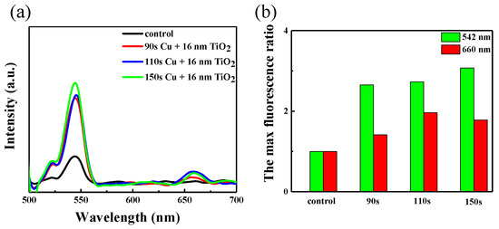 During the fluorescence test, we selected samples of copper nanoparticles at different deposition times of 2-layer TiO2, and also performed a bare control. There are two obvious fluorescence emission peaks of the NaGdF4:Yb, Er nanoparticles: green emission at 542 nm and red emission at 660 nm in Figure 7a. The intensity of fluorescence measured directly on quartz glass is weak as the amount of up-conversion material left on the glass sheet by spin coating is very low, and there is a dramatic enhancement observed in the measured fluorescence when the up-conversion material spin-coating on the Cu/TiO2 structure. This also illustrates that the localized surface plasmon resonance (LSPR) peak plays a role in luminescence enhancement of up-conversion nanoparticles. The SPR of the Cu/TiO2 red shifted to 835 nm, matching well with the excitation wavelength, as can be seen in Figure 4. The ratio of different fluorescence emission is recorded in Figure 7b. It can be seen that as the time of copper deposition covered TiO2 increases, the maximum fluorescence ration overall increases gradually. Thus, with the LSPR peak is turned to 835 nm, the ratios of green and red emission can be about 3 and 2 times, respectively. The results show the LSPR with the excitation field can influence the up-conversion luminescence and then cause a strength enhancement of the local excitation field [35].