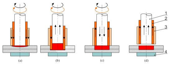 Figure 2. Stages of the Refill Friction Stir Pot Welding (RFSSW) process: touchdown and preheating (a), plunging (b), refilling (c), and retreating (d): 1-pin, 2-sleeve, 3-clamping ring, and 4-bracking anvil. - the sleeve plunges the sheet to the desired depth, and, at the same time, the pin moves in the opposite direction (Figure 2b),