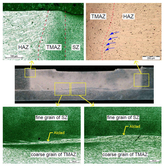 The weld made using RFSSW consists of two main parts: the nugget of the joint and the HAZ. The nugget of the weld has a fine grain structure. This indicates the occurrence of the recrystallization caused by both high heat and pressure. In the bottom part of the weld, a plated coating (Alclad) is observed. Alclad within the weld nugget, which covered the sheet metals to protect them against corrosion, causes heterogeneity in the structure of the weld. These heterogeneities reduce the weld strength and clearly indicate the direction of flow of the material. The Alclad has a higher thermal conductivity (229 W/mK) where BM (134 W/mK) transfers the heat out of the joint very quickly. The Alclad layer also exists in the lower zone of the joint which, despite reaching a much higher temperature, is not degraded.