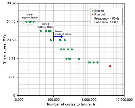 Fatigue strength tests were carried out on an Instron ElectroPulsTM E10000 testing machine (Instron, Norwood, MA, USA) designed for dynamic and static testing on a wide range of components and materials. Fatigue tests were carried out at room temperature with the following conditions: a frequency of 50 Hz and a limited number of cycles equal to 2 × 106. The coefficient of the stress cycle of R = 0.1 used is often used in aircraft component testing [38] and corresponds to a tension-tension cycle in which σmin = 0.1σmax. Four specimens were tested for each level of amplitude.