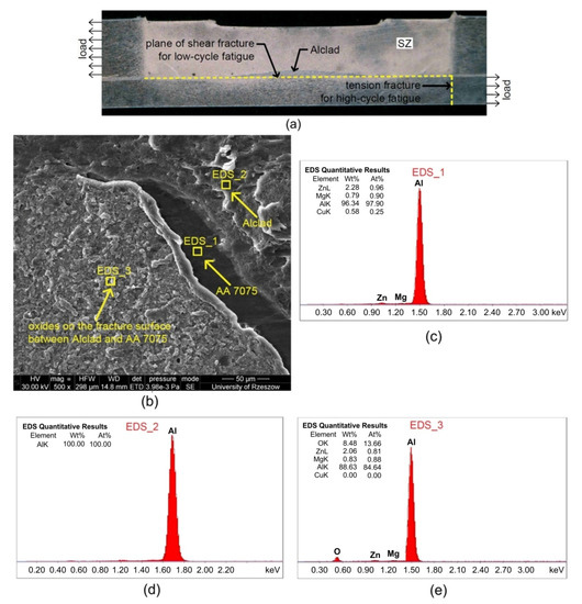 Plastic deformations of the weld resulting from fatigue cycles are the cause of stress concentration at the boundary of the clad material in the weld structure and the fine-grained base metal (BM) in the SZ zone. Moreover, a thin and brittle layer of oxides was formed in the welding process as a result of thermo-mechanical changes in the BM. The presence of aluminium oxides aggravates the inhomogeneity of the weld structure around its periphery and is a source of crack nucleation. The oxides are considered to contaminate the weld. Aluminium and its alloys are very reactive with atmospheric oxygen and form a layer of oxide on its surface [39]. The oxide layer can cause entrapped oxide flaws in the stir zone. The existence of oxides in the nugget zone is confirmed by EDS analysis of the fracture surface of the joint in the area of the upper sheet that underwent fatigue shearing after 22,348 cycles with a maximum variable force value of 2000 N. Figure 5b shows a fragment of the fracture surface with three characteristic areas of BM, a clad layer, and the boundary surface between the clad and BM containing a significant amount of oxides. The chemical composition in these areas is revealed by EDS spectra: EDS_1 (Figure 5c), EDS_2 (Figure 5d), and EDS_3 (Figure 5e), respectively.