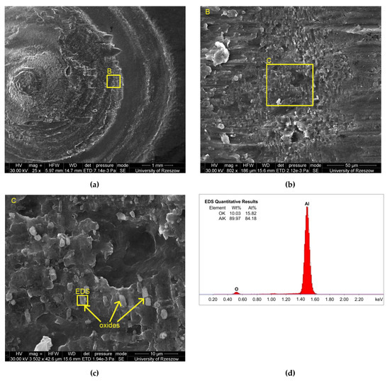 For a variable force with a maximum value of 2000 N, all the test samples exhibited the shear model of failure. Figure 6a shows the fracture surface in the shear plane of the lower sheet for a joint that was destroyed after loading more than 22,348 cycles. The presence of oxides on the surface of the clad material in the nugget zone was demonstrated on the basis of EDS spectra of fatigue fractures (Figure 6b–d). A high content of oxides on the fracture surface was also observed in the case of other samples that were destroyed as a result of shearing. Figure 7 presents a SEM micrograph of a sample that was destroyed after loading more than 26,913 cycles.