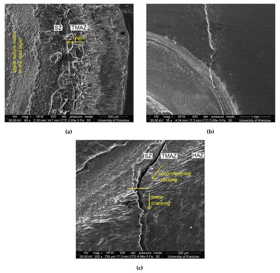 In the case of selected specimens, especially those characterised by higher fatigue life from among those loaded with a variable force with a maximum value of 2000 N, SEM analysis has shown that, despite the fact that the samples were destroyed by shearing, the second mechanism of fatigue cracking progressed in parallel to the shear fracture. In the lower sheet, transverse cracks were disclosed, which were the result of stretching this sheet. This type of crack was usually initiated at the boundary of the SZ and TMAZ in the vicinity of the axis of the joint, and propagated toward the edges of the sheets. In the first phase of fatigue loading, the fatigue crack propagated along the weld perimeter, after which it took a linear direction. Figure 8a shows the fatigue fracture for a joint, which led to damage after 22,348 load cycles.