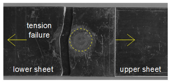 In the low stress range of fatigue strength, determined by the number of 105 cycles with variable force, all test specimens were destroyed as a result of stretching the lower sheet (Figure 9), which was thinner than the upper sheet. In the low stress range of loading conditions, there are no plastic deformations caused by subsequent load cycles with a variable load. Hence, there is no crack initiation at the boundary between the clad material lying at the bottom of the weld and the fine-grained material.