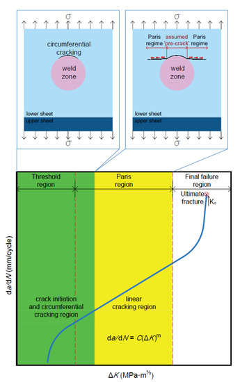 The SZ, TMAZ, and HAZ have different properties in relation to the native material. In the RFSSW process, the material in the previously mentioned zones were subjected to thermo-mechanical change. This caused grain refining and modification of the mechanical properties of the material as a result of high temperature. Therefore, the mechanisms accompanying fatigue cracking and its initiation in the area are omitted in this analysis. The analysis was started when the direction of crack propagation was already linear and was propagating toward the edge of the sheets. Paris’s law was valid for the linear cracking in the quasi-transverse direction to the load direction. Figure 10 shows in schematic fashion the area of validity of Paris’s law (or Paris-Erdogan law) for the lap-shear specimens analysed. In this graph, the rate of crack growth da/dN is expressed on a logarithmic scale, and the amplitude of the stress intensity factor ΔK is expressed on a linear scale. The ΔK is a material constant at a given stress ratio R. The length of the initial crack was adopted in the analysis as “pre-crack” (Figure 11). The threshold region in the propagation in Figure 10 does not occur for the ΔK-values below the threshold level. The Paris region corresponds to stable macroscopic crack growth. The final failure region is associated with the high crack growth rate prior to failure.