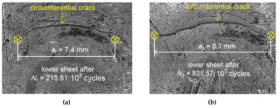 Experimental verification was carried out thanks to which it was possible to confirm the accuracy of Paris’s law for the selected fatigue area of the RFSSW joint. For selected specimens subjected to fatigue loading, measurements of the distances between the ends of cracks (Figure 11) were conducted during the tests. These measurements were carried out when the direction of crack propagation in the lower sheet changes from peripheral to quasi-transverse. These distances were assumed as ’pre-cracks’ and then based on Paris’s law. The theoretical courses of crack propagation were determined according to Equations (1)–(4).