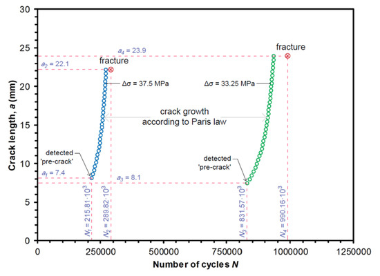 The predicted evolution of crack length according to Paris’s law is shown in Figure 12. In general, the experimental results are well predicted using the Paris equation for specific loading conditions and geometrical configurations. This conclusion is in accordance with the results of Theos [43] who conducted fatigue analysis of welded aircraft wing panels. The highest consistency was obtained for the joint, which cracked at the number of cycles of N = 289.82 × 103. The weld was resistant to destruction when the Paris law underestimates the number of cycles to failure N. The Paris equation has some limitations, i.e., asymptotic behaviour in both the threshold and final failure region is not described with this equation. Moreover, the stress ratio is not accounted for the crack growth. A significant portion of the fatigue life is occupied in the subcritical crack growth region described by Paris’s law, particularly structures constructed from sheet or plates.