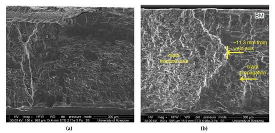 Microstructure and fracture morphologies of selected specimens were analysed using a S-3400N (Hitachi, Chiyoda, Japan) variable pressure scanning electron microscope (SEM). The samples were etched using Keller’s solution (2 mL HF, 3 mL HCL, 5 mL HNO3, and 190 mL H2O). When analysing fatigue fractures, an analysis of the chemical composition was performed on selected areas of the fracture surface to verify fracture areas and identify impurities in the weld. The chemical composition analysis was conducted using energy dispersive spectrometry (EDS). Energy-dispersive X-ray (EDX) spectra were collected on the Quanta 3D 200i (FEI Company, Hillsboro, OR, USA) scanning electron microscope.