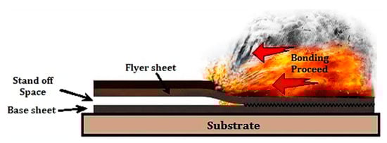 The surfaces of specimens (Al 5083 and copper sheets) were mechanically polished and subsequently cleaned by the acetone solution right before the welding process. The explosion mixture composed from Amatol 95.5 (made by combining Trinitrotoluene (5%) and Ammonium Nitrate (95%) at a speed of 2507 m/s) and an M8 detonator. To set up the desired plates for operating the explosive welding, applied concrete platform covered with a bed of fine sand as an intermediate and buffer layer. Likewise, in order to create the designed stand-off distances in each test, copper wires with adequate diameters, and with the height of designed stand-off distances set, were placed between the plates. The parallel alignment system was determined for the welding procedure []. A schematic image of explosive welding procedure is presented in Figure 1.