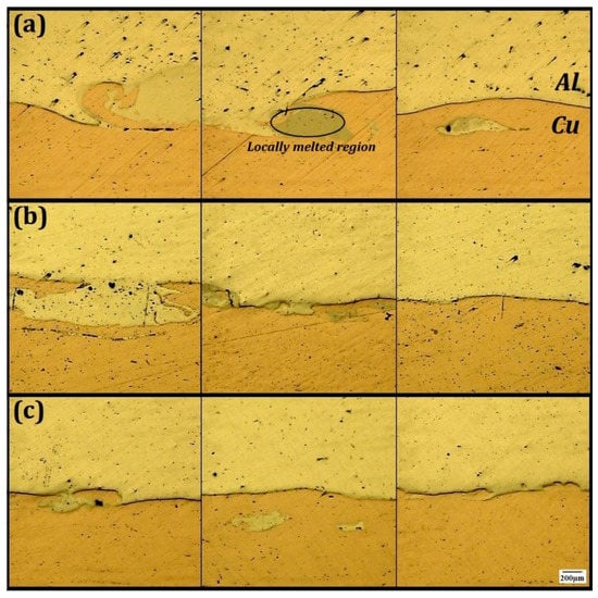 Based on Figure 3b, Al/Cu joint interface with the stand-off distance of 2 mm is almost flat. Such a confirmation of interface compared to the S1 sample was due to a decline in the stand-off distance and subsequent kinetic energy of clash. Similar to the S1 specimen, there are localized melting areas in the welding boundary. However, a lower stand-off distance leads to a lower thickness of these areas. Another worthy point in this figure was the creation of some cracks in the localized melting zones, which might be due to the formation of brittle intermetallic compounds in these regions. Macrograph of the welding interface of the S3 sample is depicted in Figure 3c. As can be seen, despite more uniform and proper joining, the formation of localized melting zones was unavoidable, and it formed as a thick layer again. In S1 specimen, the maximum stand-off distance resulted in a maximum melting thickness formation, whereas a thinner melting zone of S2 and S3 compared with S1 was a direct consequence of the lower stand-off distances.