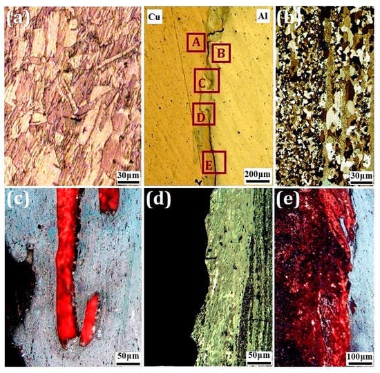 The microstructure of deformed zone around the intersection in the copper side (a), in the aluminium side (b), separated pieces of copper in Al side (c), refined Al grains in the interface (d) and interface conformation (e).