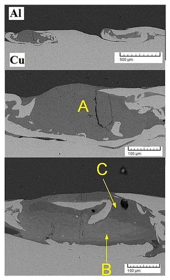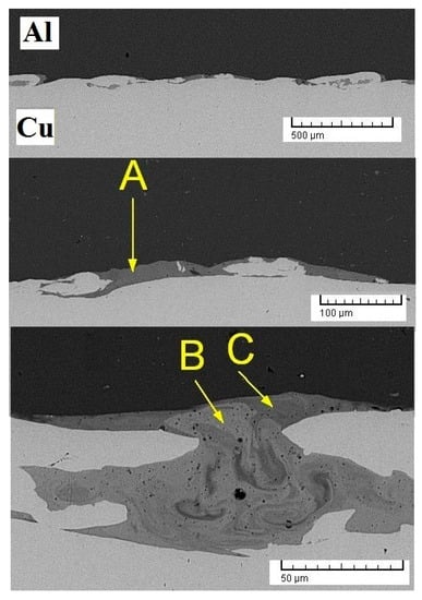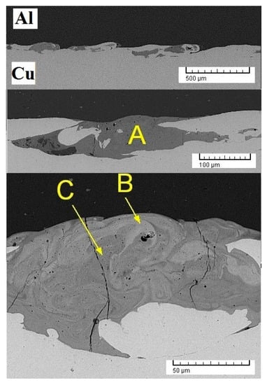 Furthermore, the welding interface has some wave-like serration. The origin of such a phenomenon has been thoroughly elucidated by Chu et al. via an investigation of the explosive welding of Fe/Ti bimetal []. They noticed some interesting key points in this realm. They reported that besides the formation of ultrafine grains at the intersection of explosive welded sheets, welding boundary is significantly susceptible to form ultrafine intermetallic layers. Furthermore, the highest heat releases in the welding boundary and interface tolerate the maximum effective strain that induces both sheets to form a wavy structure during the collision. Such conformation is also generated in the intersection of current Al/Cu bimetal (Figure 4d,e). To ascertain a preliminary insight into the nature of formed intermetallic layers after explosive welding, the XRD pattern of the welding boundary of the S1 sample is precisely analyzed (Figure 5). As can be seen, AlCu and Al2Cu phases were two essential components at the welding interface. Supplementary characterization to distinguish the distribution of second phase components performed getting SEM analysis from Al/Cu interface. Accordingly, SEM micrographs of Figure 6, Figure 7 and Figure 8 shed light on the nature of intermetallic particles in the different segments of the welding intersections. Figure 6 shows the intermetallic layer formed at the interface of the specimen S1. The local melting layer is obviously detectable in this figure. Based on the measurements, the thickness of the local melting layer is about 150 µm. Table 2 depicts the EDS analysis of localized melted layer shown in Figure 6. Accordingly, the chemical composition of the localized melted layer in point A includes 74.49% Al, 23.76% Cu and 1.75% Mg (at.%), in point B was 68.51% Al, 30.43% Cu, and 1.06% Mg (at.%), and in point C it reached 80.05% Al, 18.68% Cu, and 1.56% Mg (at.%), which confirms the formation of Al2Cu compound. At point C, the high atomic percentage of aluminium led to the darker appearance of the localized melting layer compared to point B. The formation of the frozen local melting zone could be attributed to stirring of base and flying plates due to the spinning of jumper jet trapped at the interface. Meanwhile, some cracks were formed in the localized melting region (Figure 6), considering the brittle nature of Al/Cu compounds []. In fact, the formation of such cracks could be attributed to the remarkable fragility of this region as well as the solidification contraction []. Indeed, it can be highlighted that the solidification of the melted zone in this work is rather similar to that one occurs during the soldering or brazing technology that is presented in the literature []. For instance, in the soldering/brazing of Ni/Al/Ni, at first, Al3Ni2 and Al3Ni phases were formed the same as the Al2Cu and AlCu phases which were formed in this work []. As a matter of fact, the absence of AlCu phase implies that the solidification was metastable as a result of being rapid, and Al2Cu was formed as a consequence of partitioning between liquidous and the metastable solidus. This finding is in line with previous works [,]. In fact, it is believed that the rapid solidification at the welding interface can be a segregation-less and diffusion-less phenomenon [,].