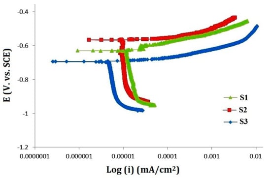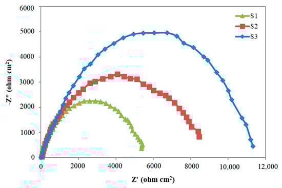 In this study, the diameter of the Nyquist curves (Figure 10) is considered as the polarization resistance (RP). In other words, the only available capacitive loops are related to the charge transfer resistance between the metal and outer Helmholtz layer (OHP). These observations indicate that the corrosion behaviour was under control through the charge transfer process. Dai and Qin et al. argued that the radius of the capacitor arc in the Nyquist plot implies the ability of the solution ions to cross through the passive layer and reach to the metal electrode. Hence, the larger radius of the capacitor results in lower corrosion tendency [,].