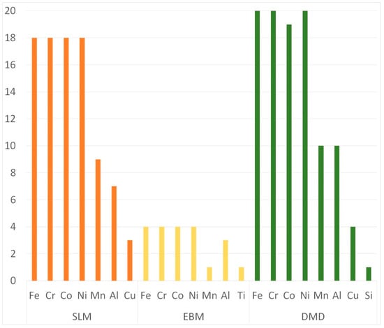 Figure 2 shows an analysis of the frequency of the alloying elements used in the different technologies and the most used the core group of elements of the CA (Fe, Ni, Cr and Co). Figure 3 illustrates the percentage of studies using the different alloying approaches employed in additive manufacturing.