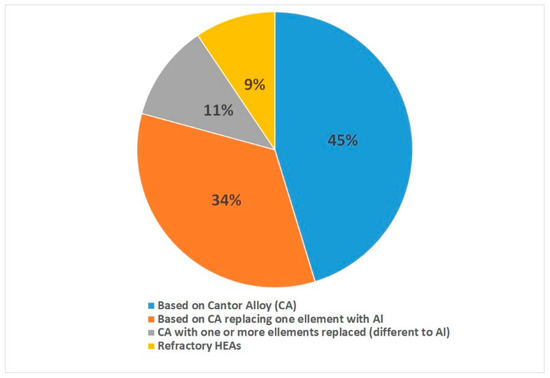 If we analyze the published papers, approximately half of them address the Cantor alloy (CA) [2], which is an equi-atomic alloy composed of CoCrFeMnNi. This coverage could be a consequence of the scarce availability of pre-alloyed gas atomized powders in the market, which forces use of the most-studied alloy, especially in the case of the powder bed systems in which fully alloyed powders are a must. Approximately 30% of the papers report modifications of the Cantor alloy with different additions of Al. As it will be discussed later, Al is a strong BCC stabilizer; this can allow a lot of possible dual microstructures (FCC-BCC) opening to the heat treatments the possibility of improving the mechanical properties.