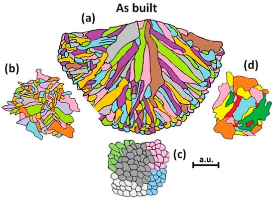 If we analyze the microstructural study conducted in those papers in which the CA was used, it is clear that the microstructures develop through an FCC single phase and follow, in some sense, what could be predicted in a conventional ingot solidification process. In fact, during any of the two main AM processes (powder bed or powder feed), the powder is fully melted and solidified on a substrate that acts as a large heat sink. This solidification process takes place in a small space, and its evolution depends on the conditions of the process: the energy of the laser beam, cooling speed, temperature of the substrate, etc. In some cases [28,29,30,31,32], the authors only report a columnar microstructure with grains growing along the built direction. Other authors refer to the presence of a cellular structure (far from the equiaxed structure) that can be transformed into an equiaxed structure through an annealing process [33,34]. In most cases, the columnar structure coexists with equiaxed grains [35,36,37,38,39], especially in the final step of the solidification pool or near the walls of the solidification area, where columnar and equiaxial grains can progress together. Figure 4 summarizes the microstructural appearance of the “as built” s state when a laser method is used. In Figure 4a, we observe a typical epitaxial configuration in which the columnar structure is developed in the built direction and is transformed into random columnar (b), granular (c) or nearly equiaxial (d) grains depending on the position and the cooling rate.