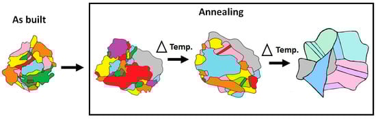 These are a subset of the possibilities, because the number of variables in the process (including the building speed or the energy of the beam) can modify the microstructure in many aspects. These microstructural features also can be changed via an annealing treatment. If we anneal the “as built” alloy, as shown in Figure 5, the microstructure tends to evolve into different situations: grain growth, evolution to equiaxial grains and development of twins.