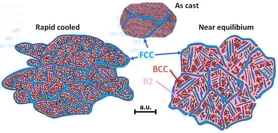 Microstructural approach through a schematic illustration (made from [24,51,53,54,55,56,57,58,59]) for the “as built” AlCoCrFeNi and EBMed near the equilibrium conditions and rapid cooled. The magnification mark is arbitrary due to the different papers used, but is in the range of 2–15 µm.