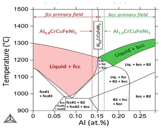Special mention could be made in the analysis presented in [38]. In this study, a base alloy of AlXCuCrFeNi2 (where the x value ranges from 0.8 to 1) (Figure 7) is used to analyze the microstructural evolution with attention to the predominant phase during solidification (through LENS process). In this study, a deep thermodynamic study of the AlCuCrFeNi system is performed by analyzing the ternary diagrams grouping the elements by Ni-Cu-Cr, Ni-Cu-Fe and Ni-Fe-Cr. It is interesting to note the calculated isopleth for AlXCrCuFeNi2 (with x = 0 to 2) showing possible phases as a function of Al content and particularly the primary field change with increasing amount of Al added to the CrCuFeNi2 alloy, as shown in Figure. For lower amounts of Al, primary solidification promotes the formation of FCC and at lower temperatures, a B2 phase can be precipitated, usually by spinodal decomposition (BCC → BCC + B2), where Cu is highly concentrated in the B2 interdendritic phase. However, for higher amounts of Al is the other way around, primary solidification takes place to produce a B2 structure and at lower temperatures, a FCC phase is precipitated in the grain boundaries. This study also explains why the increase in Al content changes the primary solidification phase from a FCC to a FCC + BCC to a BCC-based microstructure. This microstructural transition is attributed to the relatively large size of the Al atoms compared with those of Co, Fe, Cr and Ni atoms, as also confirmed in [63,64]. Consequently, the large size misfit within the FCC lattice forces it to adopt a BCC structure [65,66].