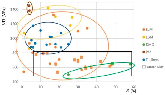 EBM materials (and a subset by SLM) can exceed TS over 1100 MPa but with lower strain. Just the opposite of those specimens obtained by DMD which achieve lower TS values but higher strain levels (up to 60%, but with a small sample of tests). The figure shows how most of the Cantor alloys belong to the selective laser melting process. What we can conclude from this figure is the versatility of these technologies in obtaining materials with many different balances between strength and elongation. Figure also displays selected results related to HEAs obtained by other alternative powder metallurgy routes [77,78] and a fair few high-strength AM titanium base alloys [79,80] to have the reference of some other structural competing alloys with the HEAs and also two references of other hot pressed HEAs [77,78].