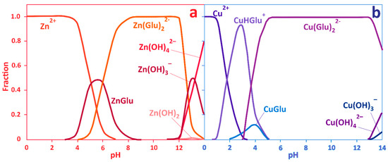 Based on Figure 1, in acidic conditions the species are dominated by free Zn2+ and Cu2+ ions. Glutamate as chelate effectively binds Zn and Cu from weakly acidic to alkaline conditions, and prevents the precipitation of hydroxides at strong alkaline pH. The figure also shows that Zn starts to hydrolyze at pH 12, while Cu at pH 13. The program was also used to model the species distribution according to pH for other elements (Supplementary file: Figure S1), i.e., Fe, Mg, Ca and Al. In general Fe and Al start to hydrolyze at weakly acidic pH (±4), while Mg and Ca tend to hydrolyze at medium alkaline conditions (pH 12).