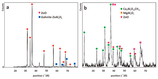 EAF dust characterization using XRD showed the mineral phase composition was dominated by zinc oxide (ZnO). XRD of the dust residue obtained after leaching (leaching condition pH 9, MSG concentration 1 M, pulp density 50 g/L and 12-hour homogenization) revealed the phases were dominated by spinel (Mg-Al oxide), calcium aluminum oxide and zinc oxide phases (Figure 2). These elements such as Al, Mg, Ca and Fe were found to be relatively retained in the solid phase during the leaching process. The XRD characterization results are supported by AMICS analysis results (Supplementary file: Tables S1 and S2 and Figure S2), which revealed the major Zn phase to be ZnO and gahnite (ZnAl2O4) in original material.