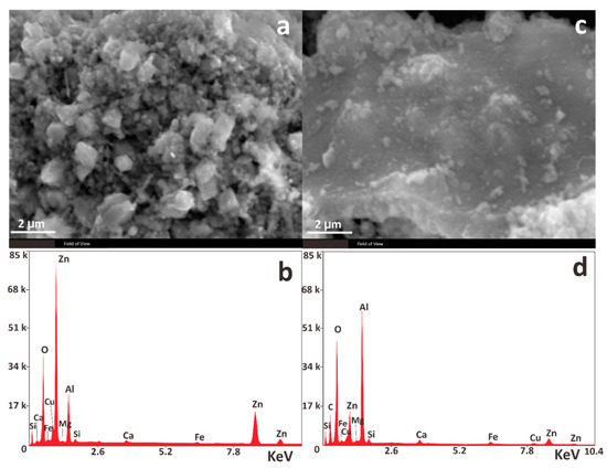 The change in elemental distribution of EAF dust before and after leaching was also explored by SEM-EDS characterization (Figure 3). Surface morphology of EAF dust changed from porous and grainy to relatively smooth. Intensity decrease of Zn and Cu peaks on the EDS profile after leaching confirmed the efficacy of MSG as lixiviant in EAF dust leaching. Qualitative mapping on the surface reveals that elements such as Al, Fe and Ca were relatively retained and even enriched after leaching (Table 4), indicating the selective nature of the leaching using MSG.