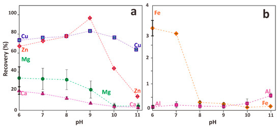 The effect of pH on the Zn and Cu leaching efficiency and selective recovery was studied between 6 and 11. The constant variables included MSG concentration 1 M, pulp density 50 g/L and an agitation time of 12 h at room temperature. pH ranges between 6–11 were chosen according to the modeling in Section 2 in order to suppress the solubility of other elements (Mg, Ca, Al and Fe). The leaching efficiency and leaching selectivity are shown in Figure 4 and Figure 5, respectively.