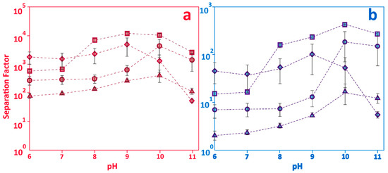 Separation factor of (a) Zn: [Zn]/[Fe] (squares), [Zn]/[Al] (diamonds), [Zn]/[Mg] (circles), [Zn]/[Ca] (triangles) and (b) Cu: [Cu]/[Fe] (squares), [Cu]/[Al] (diamonds), [Cu]/[Mg] (circles), [Cu]/[Ca] (triangles) in pregnant leach solution as function of pH.