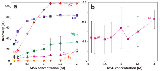 The recovery of (a) Zn, Cu, Mg, Ca and Fe and (b) Al as function of MSG concentration.
