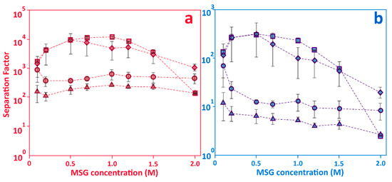Separation factor of (a) Zn: [Zn]/[Fe] (squares), [Zn]/[Al] (diamonds), [Zn]/[Mg] (circles), [Zn]/[Ca] (triangles) and (b) Cu: [Cu]/[Fe] (squares), [Cu]/[Al] (diamonds), [Cu]/[Mg] (circles), [Cu]/[Ca] (triangles) in pregnant leach solution as function of MSG concentration.