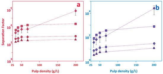 Separation factor of (a) Zn: [Zn]/[Fe] (squares), [Zn]/[Al] (diamonds), [Zn]/[Mg] (circles), [Zn]/[Ca] (triangles) and (b) Cu: [Cu]/[Fe] (squares), [Cu]/[Al] (diamonds), [Cu]/[Mg] (circles), [Cu]/[Ca] (triangles) in pregnant leach solution as function of pulp density.