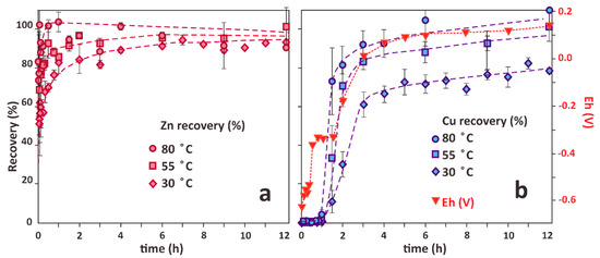 Kinetic studies were carried out at a time range up to 12 h at three different temperatures (30, 55 and 80 °C), with constant variables pH 9, MSG concentration 1 M and pulp density 50 g/L. The results in Figure 10 show that maximum leaching efficiency was attained within 120 min for Zn and 4 h for Cu at 30 °C. At higher leaching temperature, recovery reached saturation in a shorter period. Figure 10b shows the recovery of Cu is delayed about 1 h. Based on Eh monitoring, in the early stage of leaching the aqueous phase was reductive, which inhibited the oxidation and complexation of Cu by lixiviant. As leaching progressed, the aqueous phase became oxidative, favoring the oxidation and complexation of Cu.
