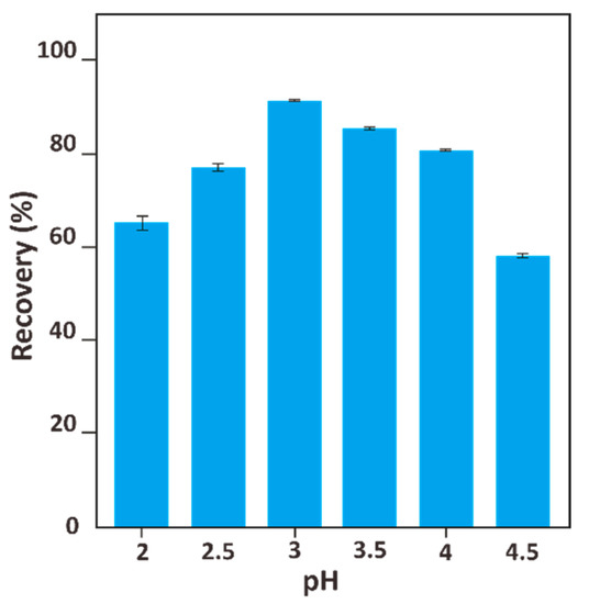 Due to the significant amount of MSG used in leaching and to sustain the leaching scheme, the regeneration of glutamate is required. Glutamate could be recovered from the pregnant leach solution as precipitate by acidifying the solution to the pH between 2–4.5. In this pH range glutamate is precipitated as neutral species glutamic acid, H2Glu (Supplementary file: Figure S4). The addition of more acid (pH less than 1) caused the formation of soluble cationic species H3Glu+. The experiment performed to recover glutamate from the pregnant leach solution showed that the optimum pH was 3, which in this pH more than 90% of the glutamate was recovered as glutamic acid (Figure 11). The recovery efficiency of glutamate was determined gravimetrically.
