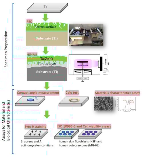 - Huang, H.-L.; Tsai, M.-T.; Lin, Y.-J.; Chang, Y.-Y. Antibacterial and biological characteristics of tantalum oxide coated titanium pretreated by plasma electrolytic oxidation. Thin Solid Films 2019, 688, 137268. [Google Scholar] [CrossRef]