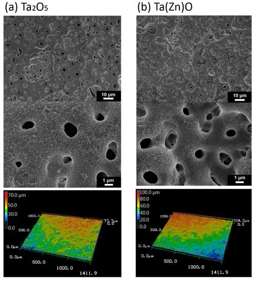 - Scanning electron microscopy and 3D laser microscopy were used to observe the morphology of the specimens. The surfaces of the Ti specimens that had been subjected to PEO were fully covered with a TiO2 layer. Through the use of HiPIMS, the deposition of the Ta2O5 and Ta(Zn)O films would not affect the porous structure on the specimen surface. The Ta2O5 and Ta(Zn)O-deposited Ti had high surface roughness and this surface roughening and porous structure may influence the biocompatibility. The results of water contact angle measurement demonstrated that the pure Ti substrate, Ta2O5, and Ta(Zn)O specimen had contact angles of 43.13 ± 10.0°, 3.3 ± 0.36°, and 16.75 ± 3.7°, respectively. The deposited Ta2O5 coating on the porous Ti was capable of enhancing surface wettability, and adding Zn to thin films increased surface hydrophobicity as compared to Ta2O5. The deposited Ta(Zn)O contained amorphous Ta2O5 and crystalline ZnO. The development of the crystalline ZnO structure during growth is controlled by the HiPIMS deposition process.