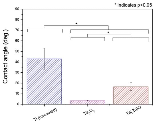 Contact angles of the uncoated Ti, and Ta2O5 and TaZnO coated titanium samples. The mean vales of contact angles were different significantly among the untreated Ti, and Ta2O5 and Ta(Zn)O coated titanium samples (p < 0.05). Post-hoc pairwise comparisons were conducted by the Turkey test. The differences were considered significant when p < 0.05.