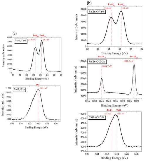 In order to investigate the oxidation states of elements present in Ta2O5 and Ta(Zn)O, XPS was carried out and the results were shown in Figure 4. The chemical bonds of the Ta2O5 and Ta(Zn)O coatings were measured and identified. As shown in Figure 4a, the XPS results of Ta2O5 coated Ti showed that Ta2O5 were deposited on PEO treated Ti, and the shape and position of the XPS peaks (binding energies) clearly indicated the formation of tantalum oxide thin films on Ti []. The doublet at 25.7~27.5 eV confirmed the Ta oxidation state (Ta2O5) [,]. The results of XPS spectra of the Ta(Zn)O samples, as shown in Figure 4b, are similar to the Ta2O5 in addition to the presence of Zn2p spectra. The chemical composition of the deposited Ta(Zn)O films measured by XPS consisted of 19.7 ± 1.9 at.% of Ta, 5.3 ± 1.5 at.% of Zn, and 75.0 ± 3.8 at.% of O. The results were similar to EDS. Figure 4b shows the Ta4f, Zn2p and O1s core level XPS spectra of the Ta(Zn)O samples. Zn 2P peaks had the positions located at 1021.7 and 1044.7 eV for the Ta(Zn)O thin films, corresponding to the chemical state of Zn 2p3/2 and 2p1/2 in ZnO []. The highly intense broad bands of oxygen confirmed the presence of Zn-O and Ta-O bonds. It confirmed the formation of ZnO and Ta2O5 composite structure, and verified that Zn was successfully incorporated into Ta2O5 to form Ta(Zn)O using HiPIMS.