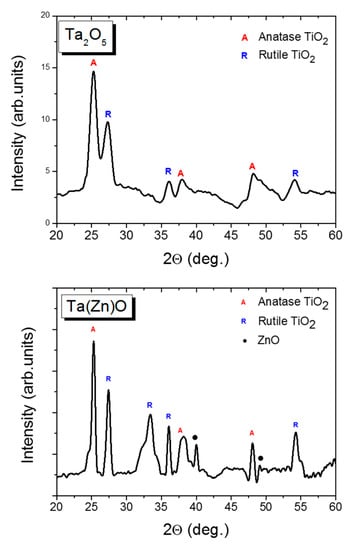 An X-ray diffractometer was used to analyze the crystallinity of the Ta2O5 and Ta(Zn)O thin films. Only the characteristic peaks of the TiO2 layer were observed for the Ta2O5 specimen (Figure 5). It showed that the Ta2O5 sample exhibited characteristic peaks of anatase and rutile TiO2 crystalline phases. The PEO-pretreated Ta2O5 sample showed characteristic peaks of TiO2 but not crystalline Ta2O5. The crystalline anatase and rutile TiO2 were formed by PEO treatment. The Ta(Zn)O films had characteristic peaks of the TiO2 layer, which was formed by PEO, and the ZnO crystal phases. It indicated that the deposited Ta(Zn)O contained amorphous Ta2O5 and crystalline ZnO. The development of the crystalline ZnO structure during growth was controlled by the HiPIMS deposition process [,].