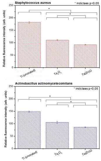 SYTO 9 stain was applied to examine the antibacterial property of the untreated Ti, Ta2O5, and Ta(Zn)O specimens against S. aureus and A. actinomycetemcomitans. In Figure 6, the relative fluorescence intensity represents the bacterial residue with STYO 9 stain. Lower relative fluorescence intensity indicates the potential and better capability of the antibacterial ability. The Ta2O5 and Ta(Zn)O deposited by HiPIMS showed lower intensity of the relative fluorescence with Syto 9 stain, and the Ta(Zn)O exhibited the lowest intensity in both of the S. aureus and A. actinomycetemcomitans bacterial colonies (Figure 6). The antibacterial capability of ZnO has been proved in previous studies [,,]. The content ratio of Zn in the surface coating is a critical issue because the zinc-oxide not only has the ability of improving the antibacterial properties but also increases the cell cytotoxicity []. To maintain both of the characteristics of biocompatibility and antibacterial ability, it is important to control the content ratio and manufacture procedure of ZnO-contained coatings.